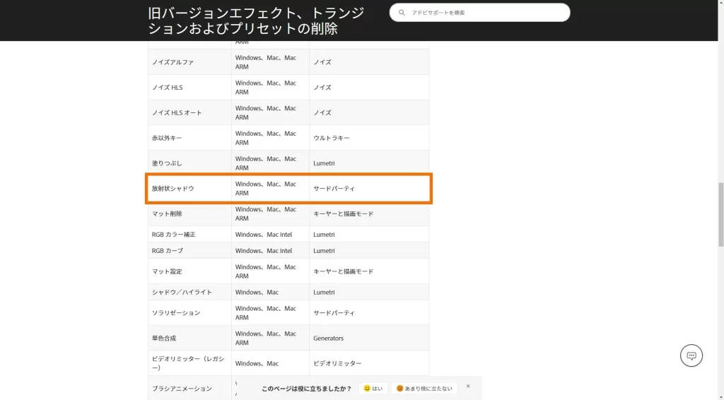 放射状シャドウは元々ビデオエフェクト>遠近>放射状シャドウで選択できたようなのですが、↑の画像のとおり私の環境ではなくなってしまったことを確認できます。
