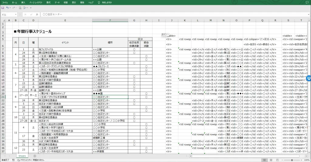 <tr><td><スポーツ>中央地区スポーツ大会</td><td>○○住区センター</td><td> </td><td>○</td></tr><tr><td rowspan="2">17</td><td rowspan="2">金</td><td><施設運営>利用者懇談会</td><td>○○住区センター</td><td> </td><td>○</td></tr>